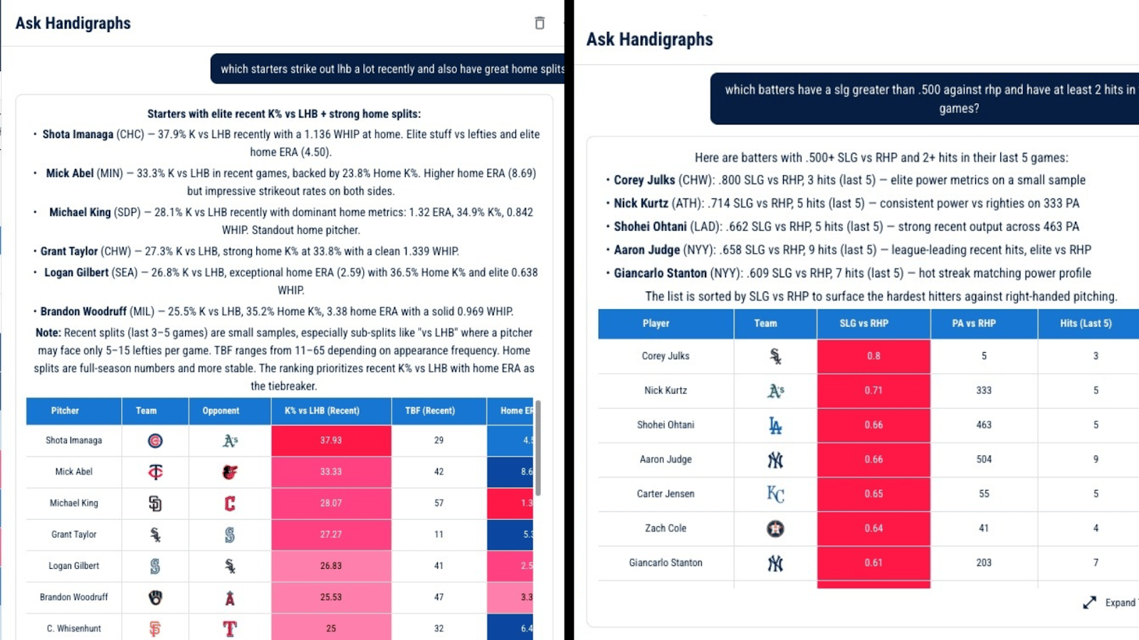 The centerpiece of the release is Ask Handigraphs, which CEO and co-founder CJ Buskey told BettingStartups is “going to become a foundational piece of the entire Handigraphs suite.” The tool effectively replaces a workflow many early users relied on—exporting data into tools like ChatGPT or Claude—by enabling natural language queries directly within the platform. “You want to know who has the best metrics over their last 10 games to hit a home run? Ask Handigraphs. Compare trends in splits for a pitcher’s strikeout rate to walk rate over the course of the season? Ask Handigraphs,” Buskey said.