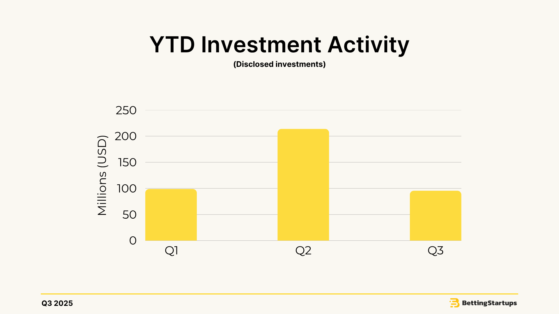 Larger raises continued to anchor overall funding volume: MyPrize ($21M) led the quarter, followed by Novig ($18M), The Clearing Company ($15M), and Yaspa ($12M)—together representing two-thirds of all disclosed capital raised in Q3.