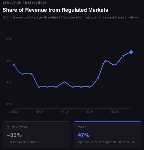 On a player-IP basis, regulated play reached 47% of Q4 2025 revenue, up from roughly 39-41% in prior quarters. Source: Evolution