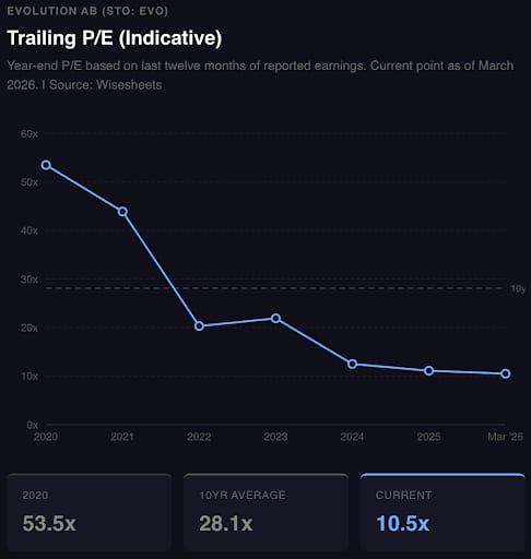 The market has de-rated Evolution from over 50 times earnings in 2020 to roughly 10 times today, yet the company still operates at a 66% EBITDA margin and generated €1.26 billion of operating cash flow in 2025. That discount now sits alongside a new capital-allocation question.